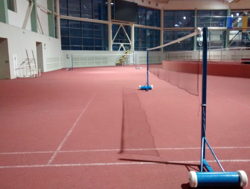 Зал для бадминтона на одну площадку с качественным покрытием Teraflex и мягким светом в здании спортивного комплекса РЦОРа по гандболу. 4 ракетки и воланы уже включены в стоимость (1 час - 17 руб).