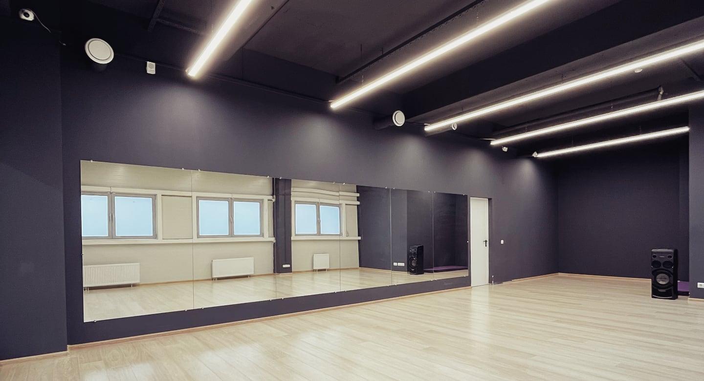 Площадь зала 65 кв м. По периметру зала располагаются зеркала, есть качественная музыкальная аппаратура. Зал идеально подходит для танцев, множества видов спорта и мероприятий.