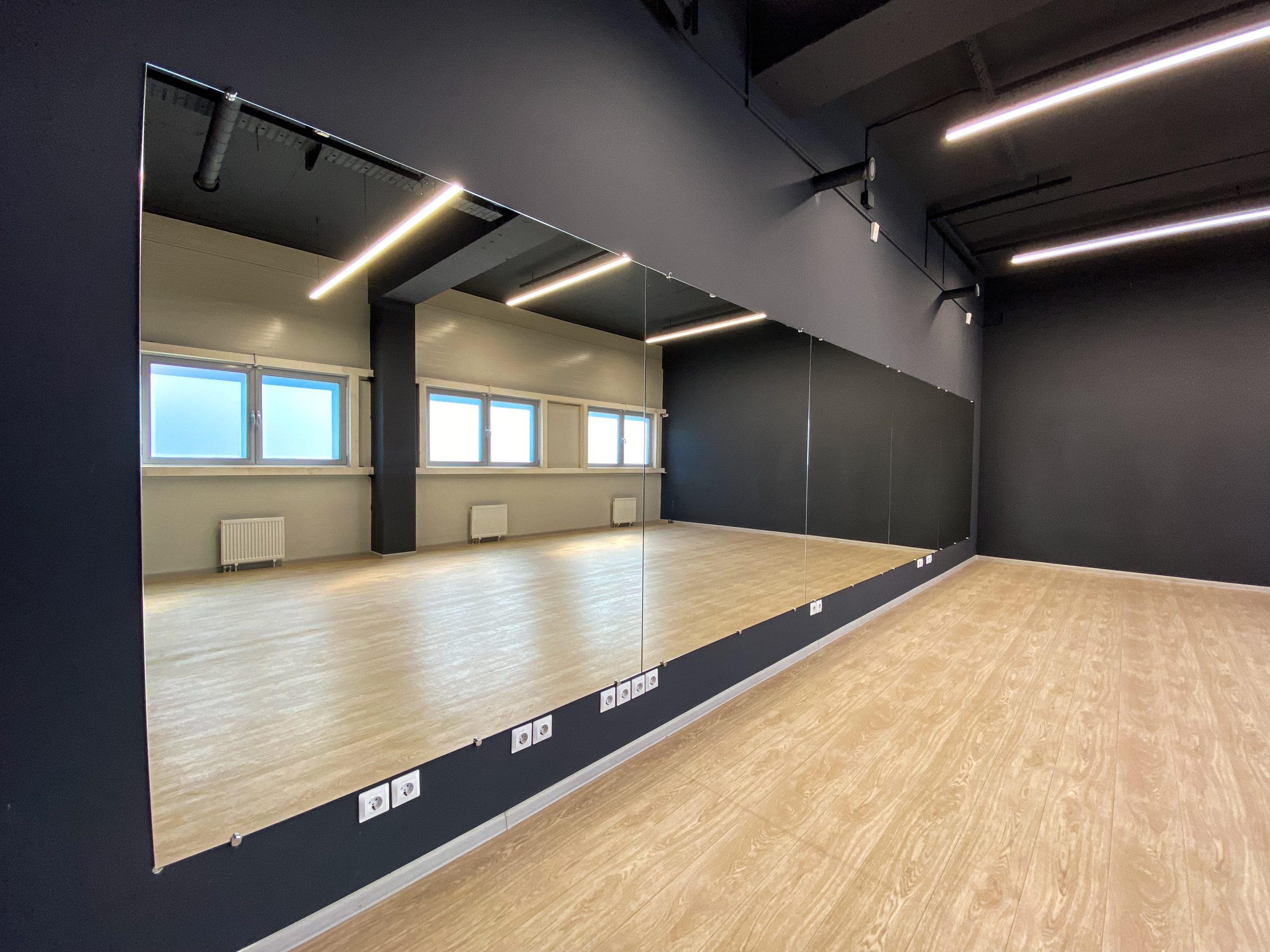 Площадь зала 52 кв м. Зеркальная стена и качественное напольное покрытие. Подходит для фитнеса, йоги, танцев, гимнастики