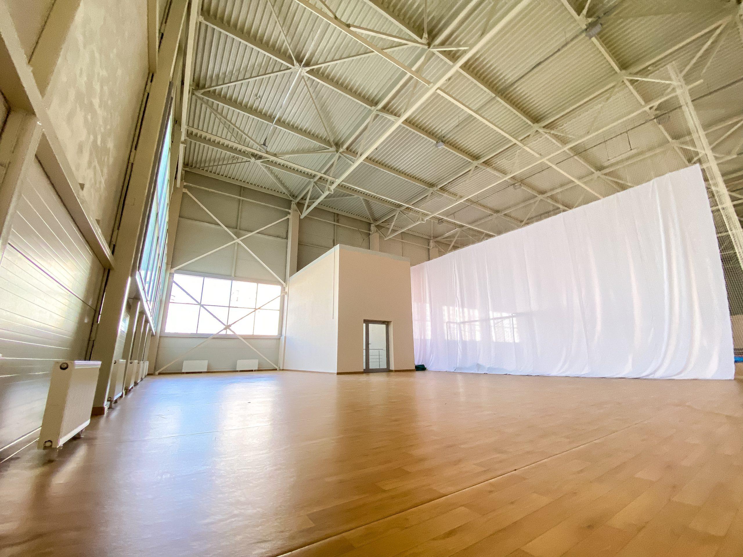 Площадь зала 160 кв м, высота потолков более 10 метров. Зал подходит для занятий танцами, гимнастики, единоборствами и множеством иных видов спорта.